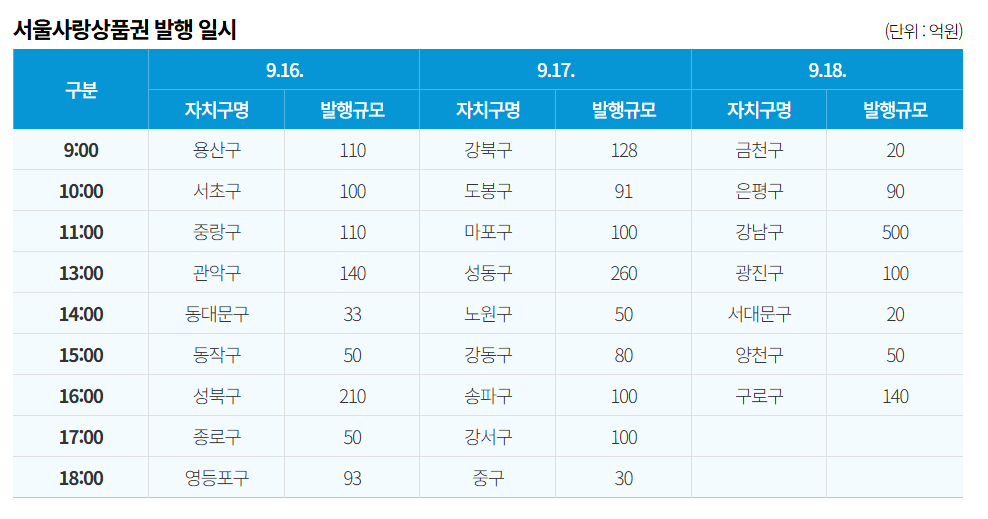 발행은 9월 셋째 주 3일 동안 자치구별로 순차 진행됩니다.